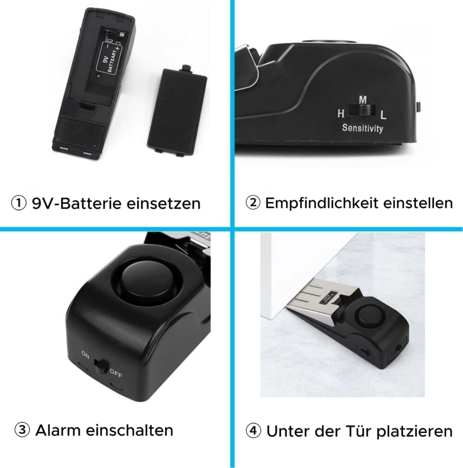Setzen Sie einfach eine 9V-Batterie ein, stellen Sie die gewünschte Empfindlichkeit ein, schalten den Alarm ein und platzieren ihn unter der Tür.